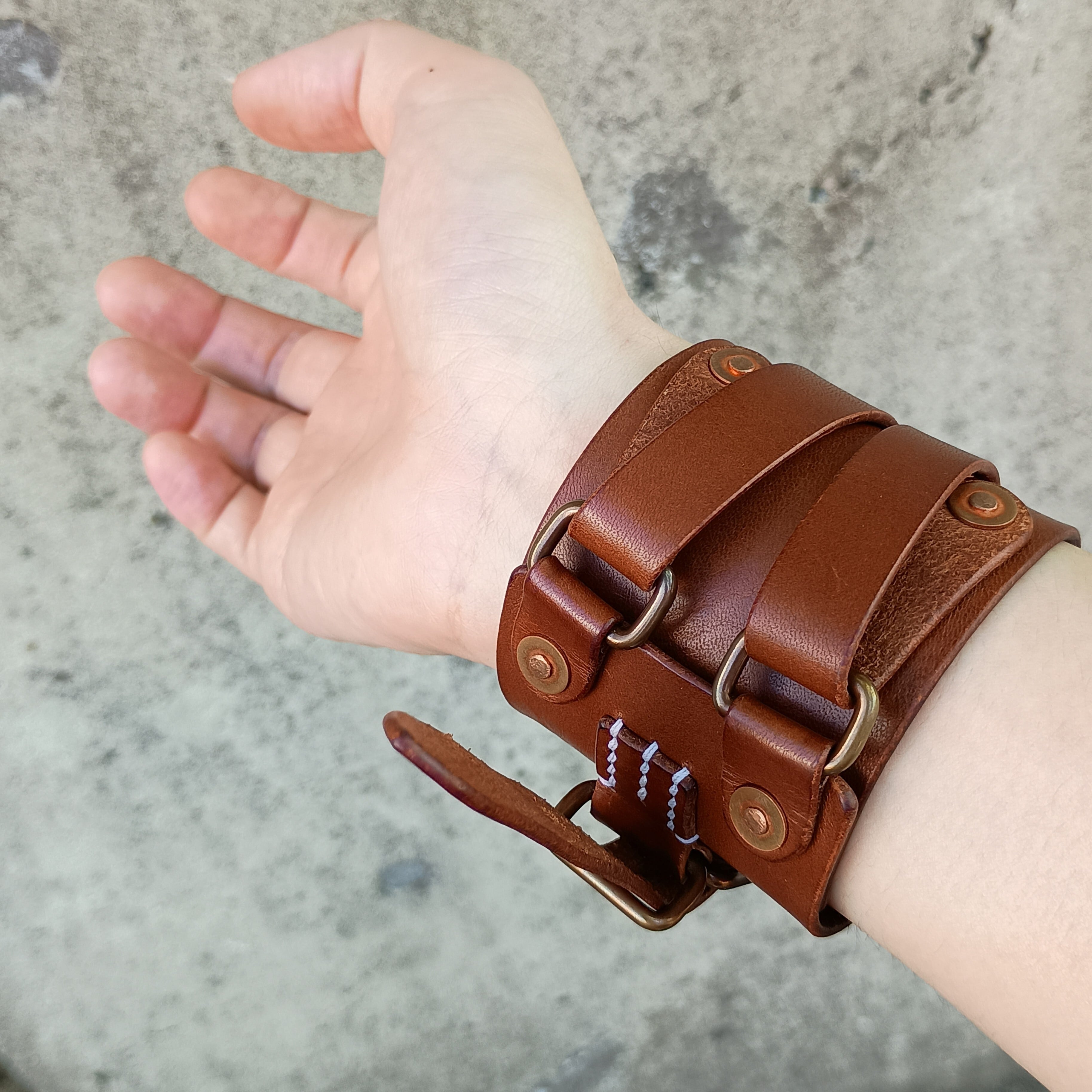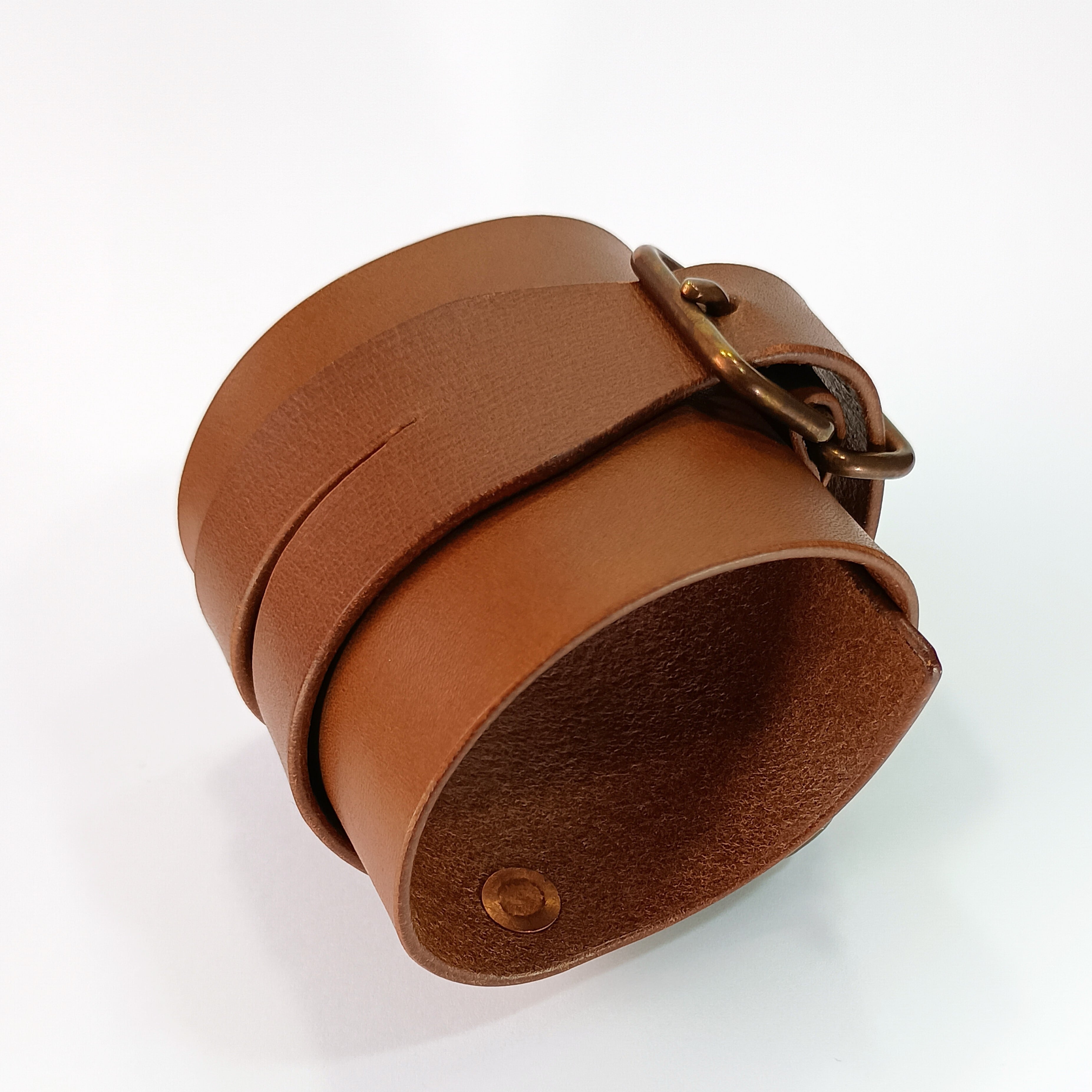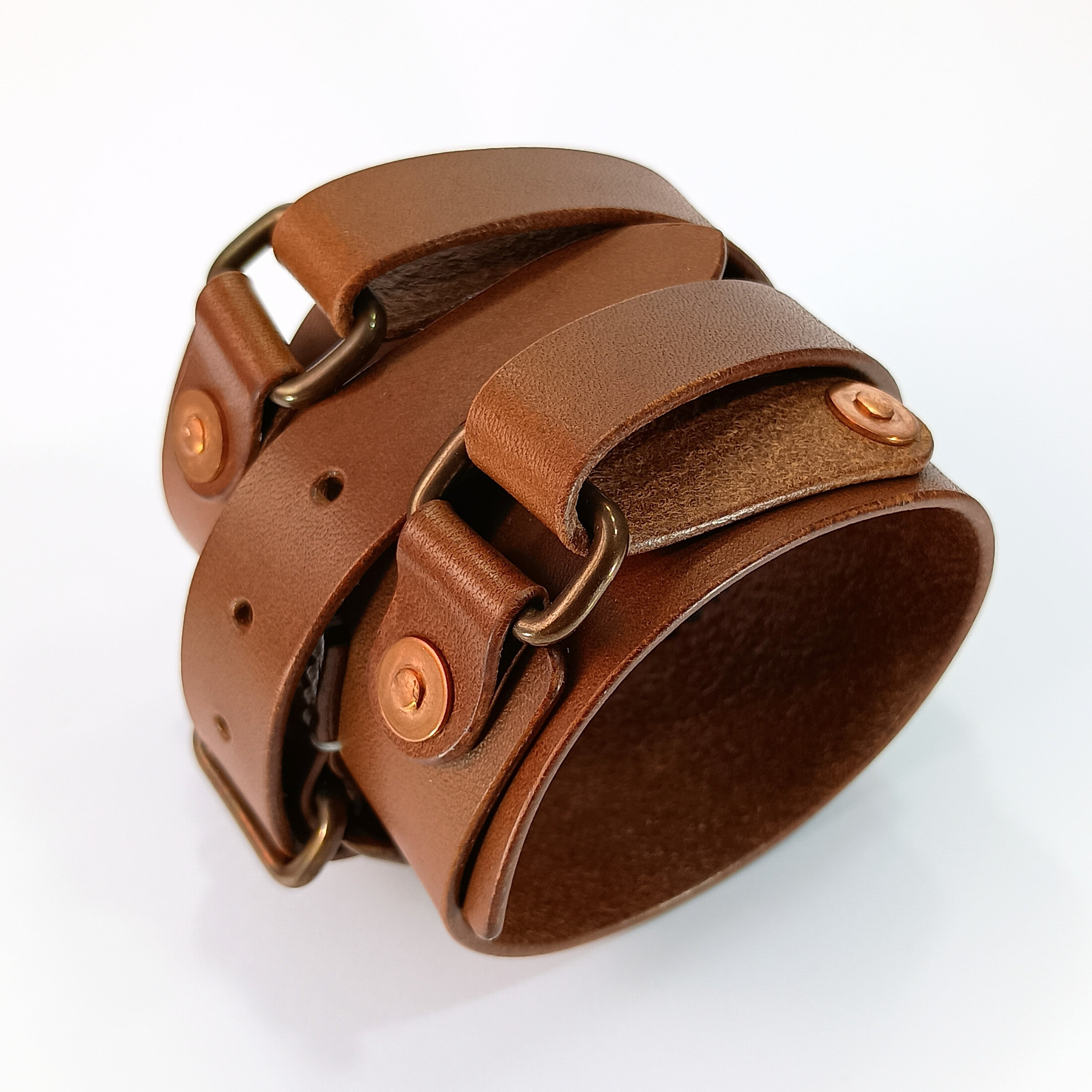 バックル・角カンは真鍮製の物をアンティーク調のカラーに加工。リベットは銅製。金具類の経年変化も楽しめます。