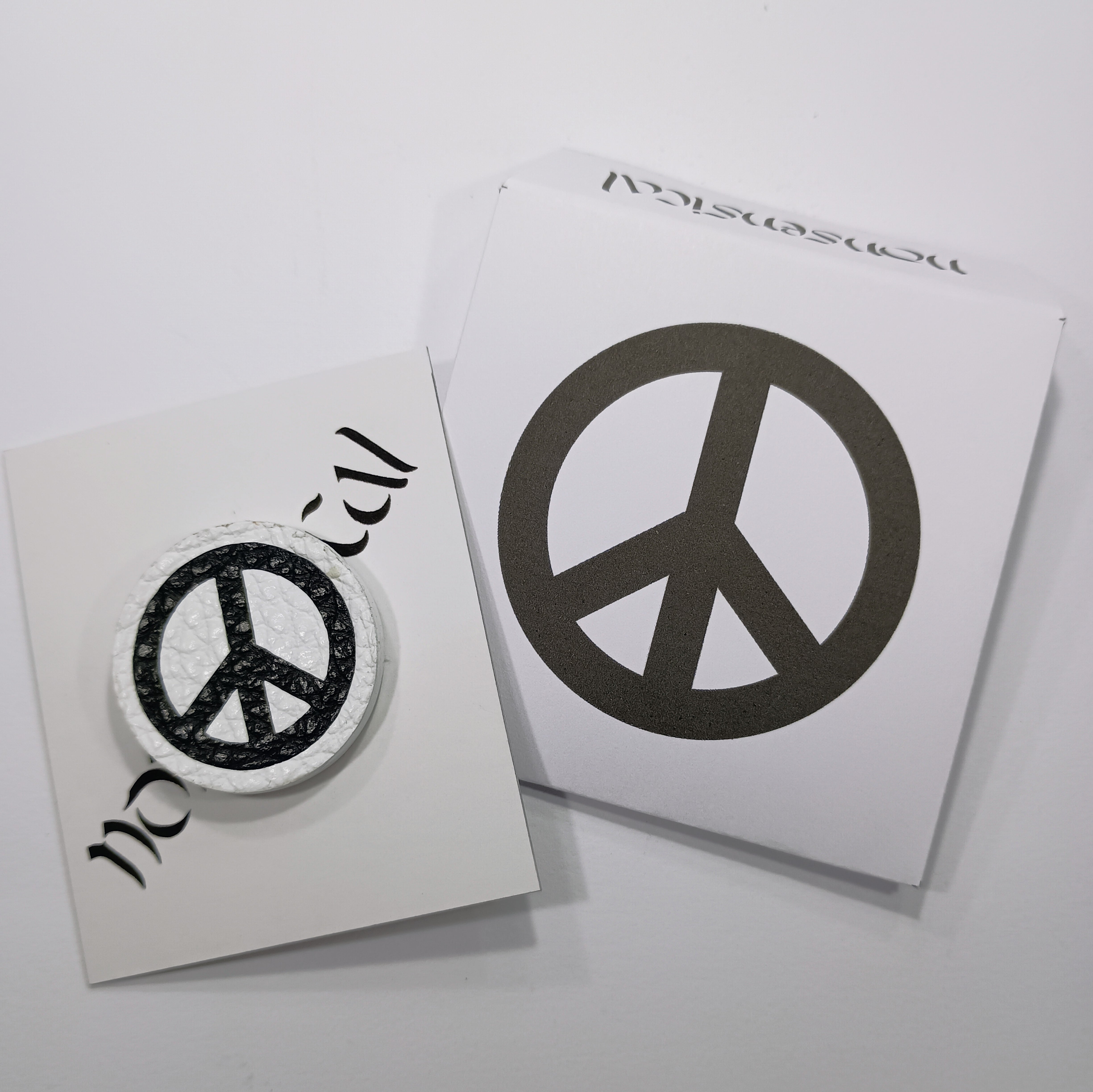 シボ入りのレザーをパーツ毎にハンドカットで切り出してはめ込んだピースサインのブローチ。